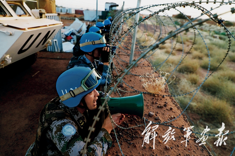 当地时间2018年11月8日,我维和工兵分队官兵开展营区安全防卫演练。快反力量到达阻绝壕一线,上士张学梅实施喊话驱离。