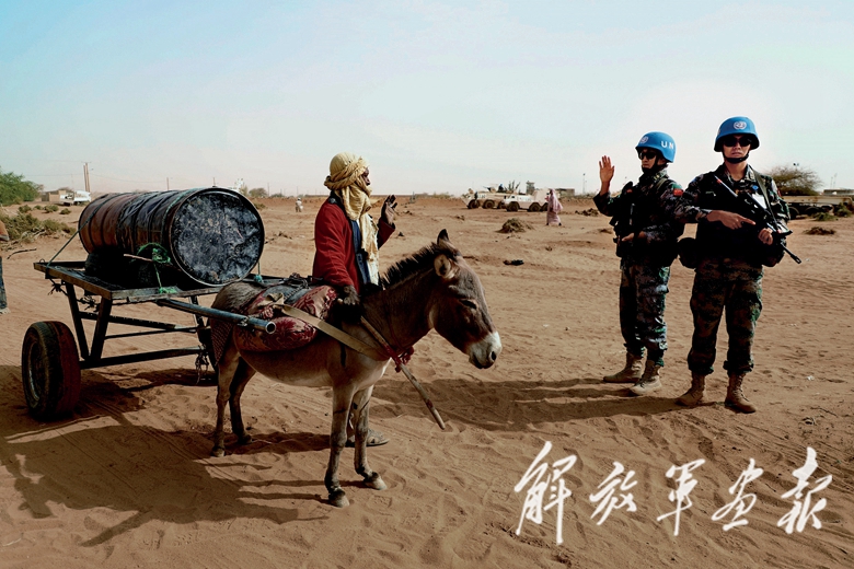 当地时间2019年2月14日,一名当地民众在从尼日尔河拉水回家途中,遇到正在警戒的我维和官兵,停下来微笑着跟他们打招呼。