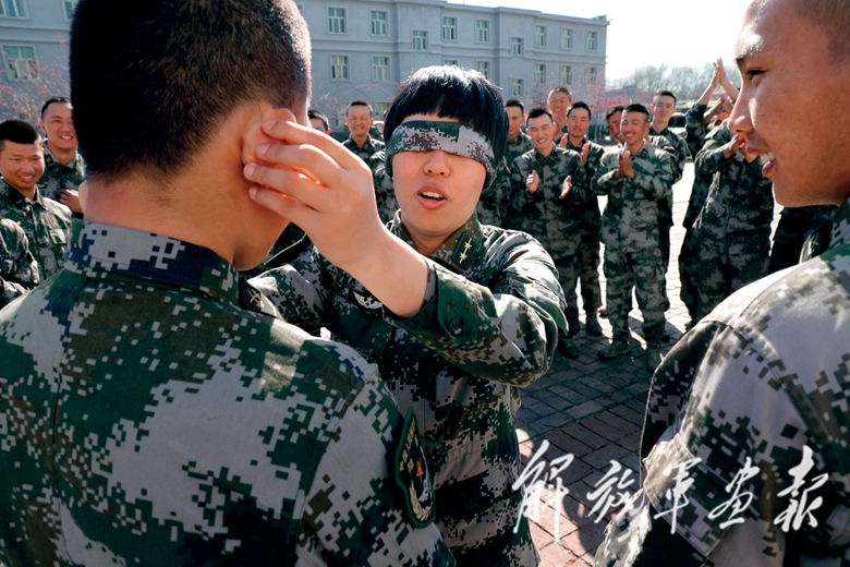 这是一场游戏,更是一次挑战。坦克五连官兵围成一圈,指导员马和帕丽蒙住双眼,通过双手感触来识别官兵。