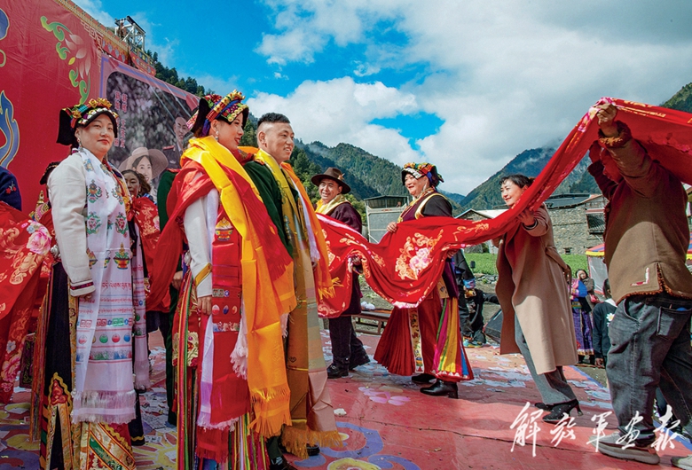 次日清晨,在新郎家乡理县朴头乡举行“萨克竖”。身着军服、胸前挂着军功章的索朗罗布和战友们整齐列队,手捧洁白的哈达,在村口迎接新娘和送亲队伍的到来。湛蓝的天空下,青山环抱的草坪上,在战友们的齐声祝福中,一对新人深情相拥……