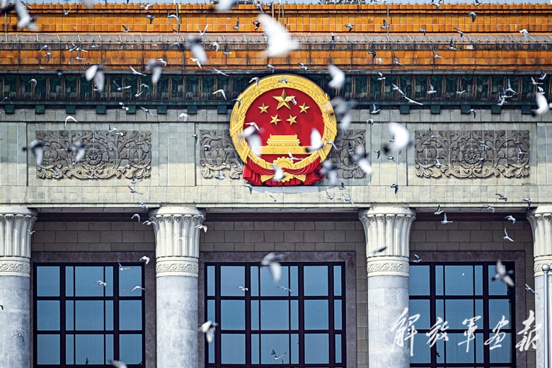 在纪念中国人民抗日战争暨世界反法西斯战争胜利80周年大会上,和平鸽飞过庄严的国徽。(摄影/新华社记者 张宏祥)