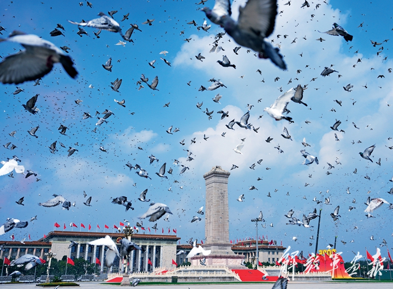 8万羽和平鸽振翅飞翔,8万只气球腾空而起,飞过天安门城楼,飞越人民英雄纪念碑,飞向更高更远的蓝天。