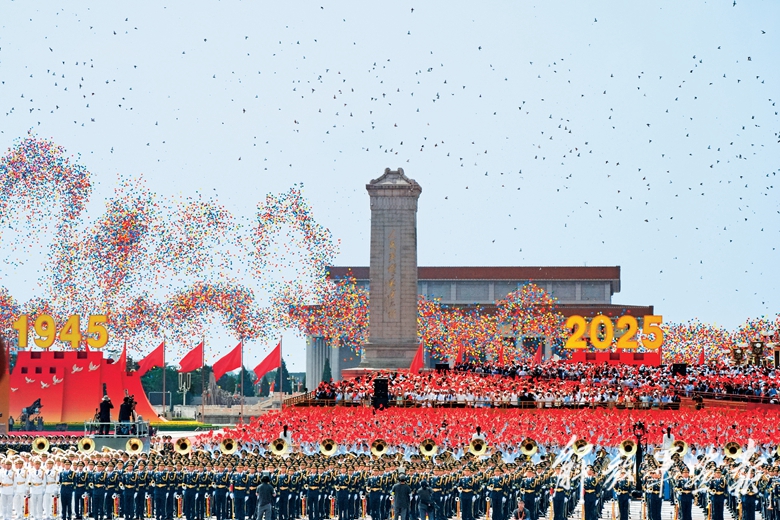 纪念中国人民抗日战争暨世界反法西斯战争胜利80周年大会现场放飞气球与和平鸽。(摄影/新华社记者 牟 宇)
