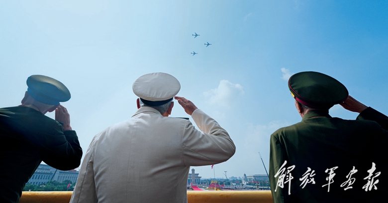 轰炸机梯队飞过天安门广场上空,观礼老兵庄严敬军礼。(摄影/新华社记者 才 扬)