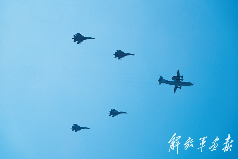战鹰呼啸,气势如虹。预警指挥机梯队飞过来了,空警-500A与歼-16战机编队、空警-600与歼-15T舰载机编队依次接受检阅。