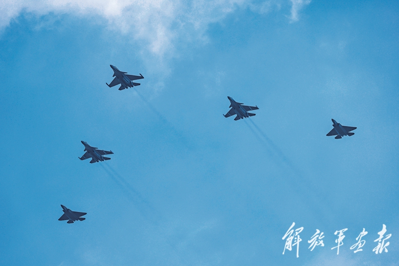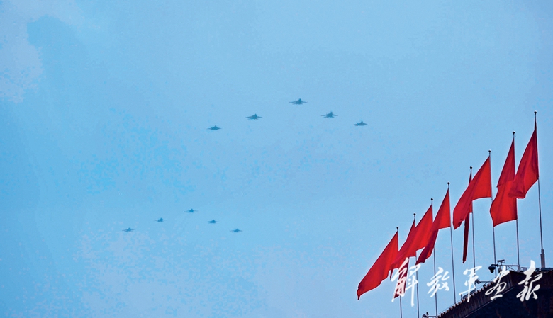 歼击机梯队以雷霆万钧之势飞越天安门上空。