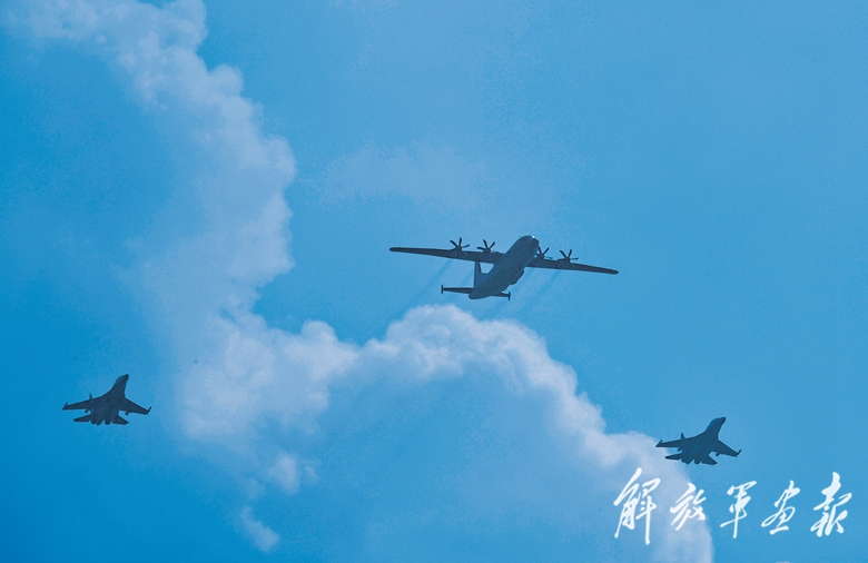 战机轰鸣,响彻云霄。3架运油-20A加油机伸出加油管,分别与2架轰-6N、2架歼-16以及2架歼-20组成3个“品”字形编队,模拟空中加油状态从观礼台上空飞过。作为我国自主研发的新一代空中加油装备,运油-20A的载油量更大、作战半径更广、滞空时间更长,能够有效增强空军航空兵的远程打击、持续作战能力。自服役以来,运油-20A常态与歼-20、歼-16、歼-10砺剑海天,联手出击,开展全天候复杂条件下加油训练,战斗足迹遍布高山远海、戈壁大漠。