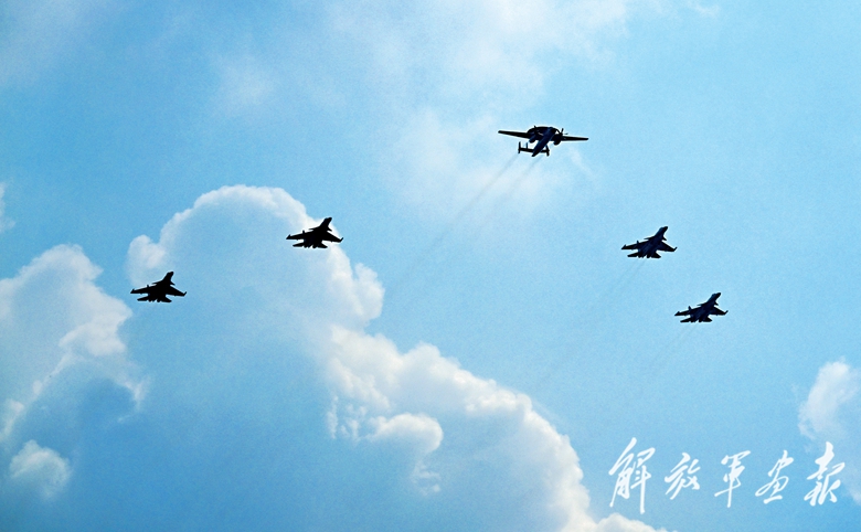 纪念中国人民抗日战争暨世界反法西斯战争胜利80周年阅兵活动中,我国自主研制的首型舰载固定翼预警机空警-600亮相蓝天,由4架适配电磁弹射系统的歼-15T舰载机护航。(摄影/新华社记者 李 鑫)