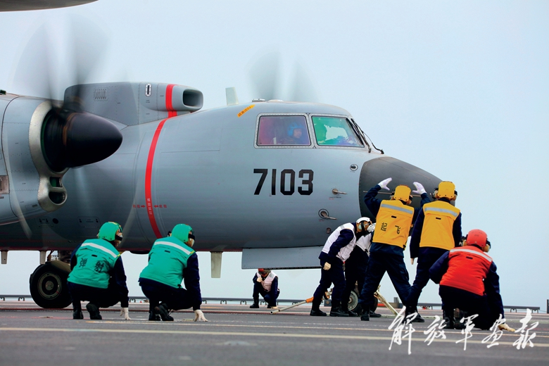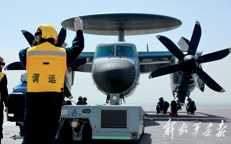 空警-600舰载预警机起飞前,放飞小组引导战机弹射入位。