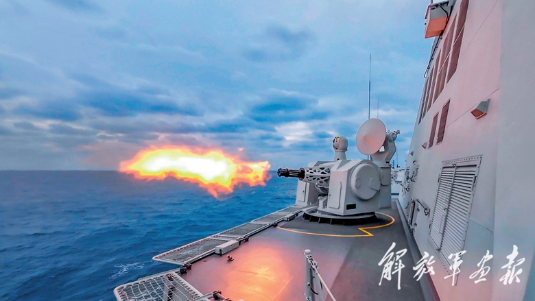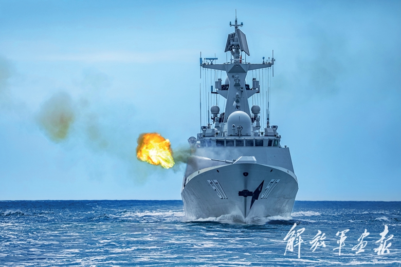“前出打击‘敌’水面目标!”航行途中,编队接到上级命令,立即向目标海区高速机动。抵近后,编队各舰快速锁定“敌”方位,完成数据共享。“预备——放!”攻击指令下达,各舰主炮立即对目标实施精准打击。