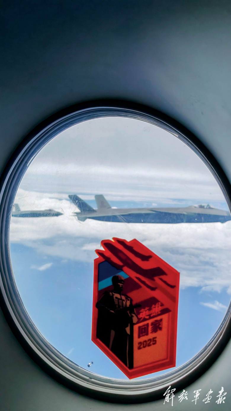 9月12日,运-20专机接运第十二批在韩中国人民志愿军烈士遗骸回国,4架空军歼-20战机伴飞护航。这是透过专机舷窗拍摄的照片。(摄影/王鸿飞)