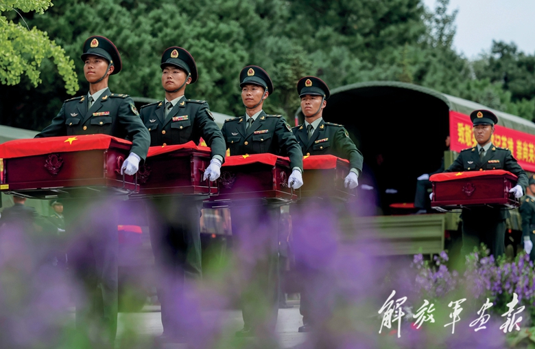 退役军人事务部部长裴金佳致祭文后,全体人员向烈士遗骸棺椁三鞠躬。27名礼兵举枪齐射,12响鸣枪划破天际,每一响都是祖国对英烈的深情呼唤。《思念曲》再次响起,全场人员静静凝视,礼兵们抬起烈士棺椁,绕场半周,缓步走向安葬地宫……