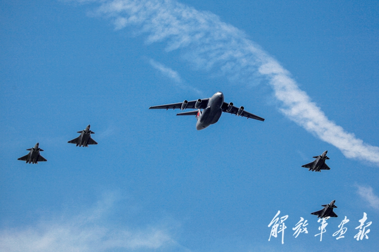 1950年,中国人民志愿军雄赳赳、气昂昂,跨过鸭绿江。“跨江50”这穿越时空的呼号,是向70多年前那支英雄之师的深沉致敬;战机护卫英烈凯旋,象征着我们永远铭记抗美援朝战争伟大胜利。“凯旋”,这昔日的期盼,终于化作战鹰长啸、划破云霄!
