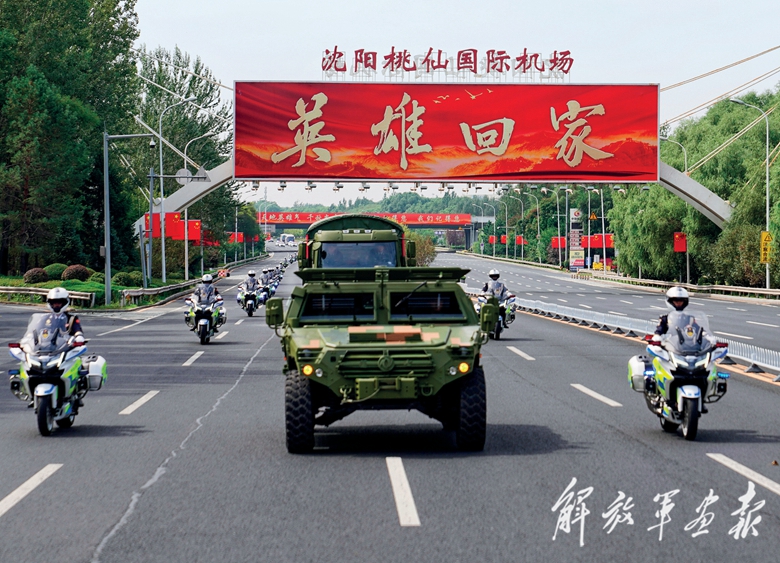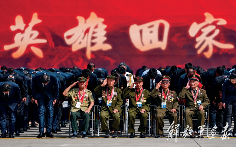 国之大事,在祀与戎。魂兮归来,增耀国华。烈士遗骸迎回仪式现场庄严肃穆,礼兵护送志愿军烈士遗骸棺椁行进至指定位置。仪式结束后,志愿军烈士遗骸棺椁在70辆警用摩托车组成的骑警车队护卫下,由6辆军用运输车送往沈阳抗美援朝烈士陵园。29.7公里的归途设置近3500面国旗,沈阳各界群众沿途列队迎接英雄回家,各交通要点、营运车辆和主要建筑打出向英雄致敬的标语。