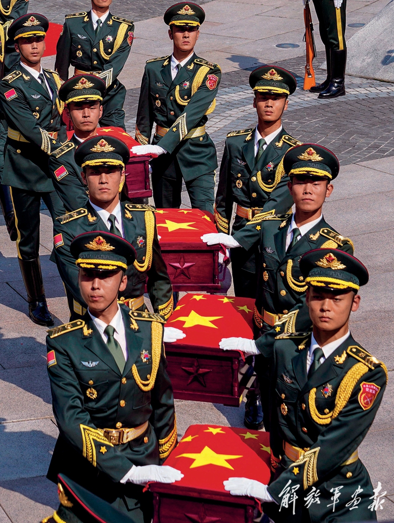 10时许,军乐队奏响低沉悠扬的《思念曲》,在解放军仪仗司礼大队战士的持枪护卫下,22名礼兵迈着稳健的步伐,缓缓护送覆盖着五星红旗的烈士遗骸棺椁进入纪念广场。棺椁被轻轻安放于军绿色绒布铺设的停放台上,庄严的中华人民共和国国歌随即响起,人们高声齐唱。