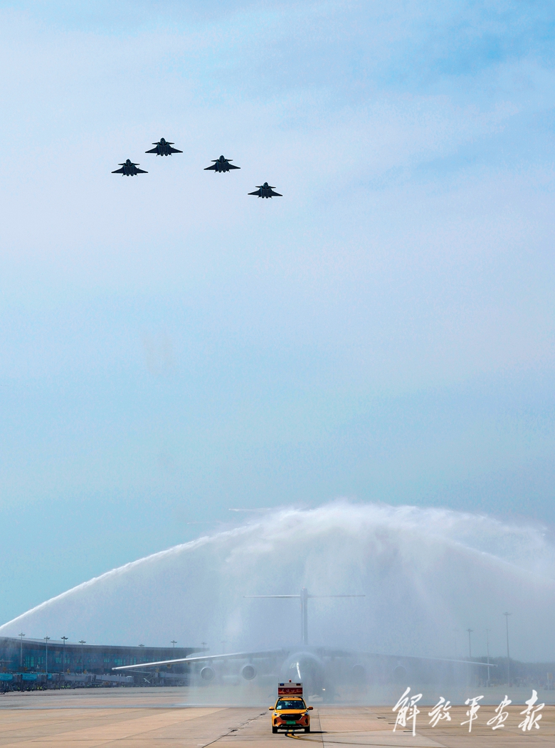 9月12日,在沈阳桃仙国际机场,接运第十二批在韩中国人民志愿军烈士遗骸回国的运-20专机通过水门。(摄影/特约记者 杨 盼)
