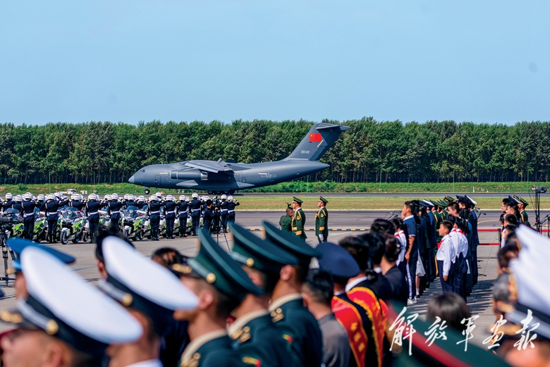 9月12日上午,接运第十二批在韩中国人民志愿军烈士遗骸回国的空军运-20专机降落在沈阳桃仙国际机场。(摄影/郑欣宇)