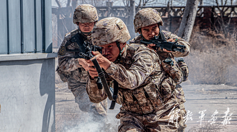 官兵开展城镇进攻训练。