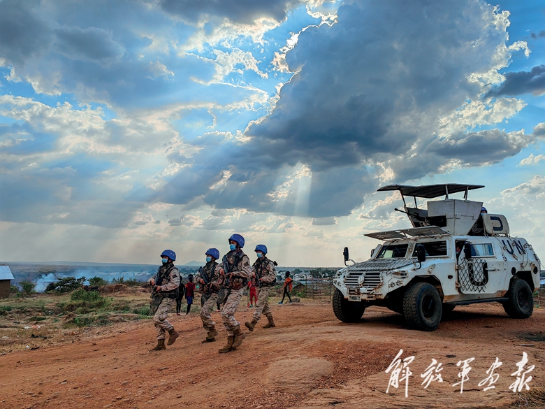 2023年1月,在南苏丹(朱巴)执行维和任务的“刘老庄连”官兵在任务区巡逻。(摄影/任郭洋)