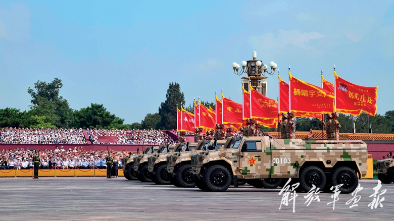 2025年9月3日,在纪念中国人民抗日战争暨世界反法西斯战争胜利80周年阅兵式上,战旗方队光荣受阅,“刘老庄连”战旗猎猎招展。(摄影/记者 张 雷)