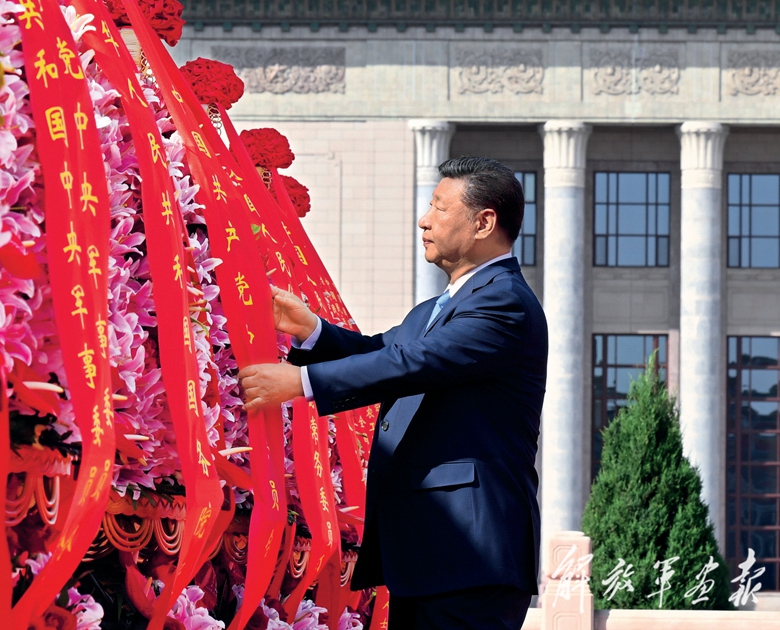 习近平迈步上前,仔细整理花篮缎带。随后,习近平等党和国家领导人缓步绕行,瞻仰人民英雄纪念碑。