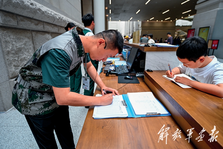 志愿者陈涛(左)在军博讲解志愿者服务登记表上签到。