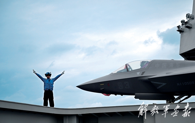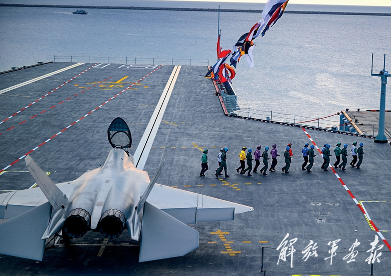 舰载机飞行员与福建舰放飞小组进行协同训练。