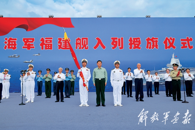 下午4时30分许,入列授旗仪式开始,全场高唱中华人民共和国国歌,五星红旗冉冉升起。仪仗礼兵护卫着八一军旗,正步行进到主席台前。习近平将八一军旗授予福建舰舰长、政治委员。福建舰舰长、政治委员向习近平敬礼,从习近平手中接过八一军旗。习近平同他们合影留念。入列授旗仪式在中国人民解放军军歌声中结束。