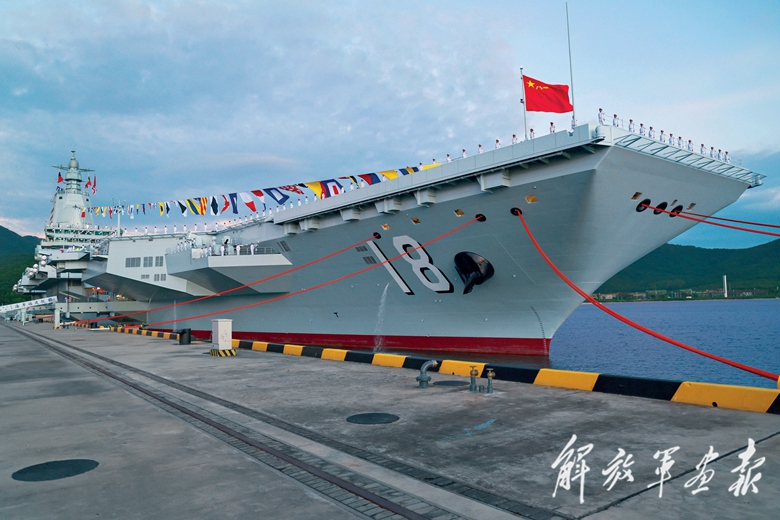 十一月的三亚,海阔天高,碧波浩瀚。军港内,福建舰踏海而立、满旗高悬,山东舰伏波相伴,来自海军部队和航母建设单位的代表2000余人在码头整齐列队,气氛隆重热烈。