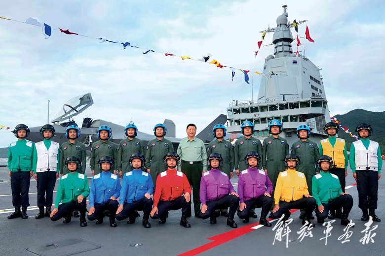 11月5日,我国第一艘电磁弹射型航空母舰福建舰入列授旗仪式在海南三亚某军港举行。中共中央总书记、国家主席、中央军委主席习近平出席入列授旗仪式并登舰视察。这是习近平同舰载机飞行员、航空保障人员合影留念。