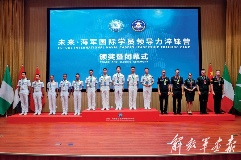 “未来·海军国际学员领导力淬锋营”活动闭幕式在海军潜艇学院举行,比赛优胜队伍代表上台领奖。