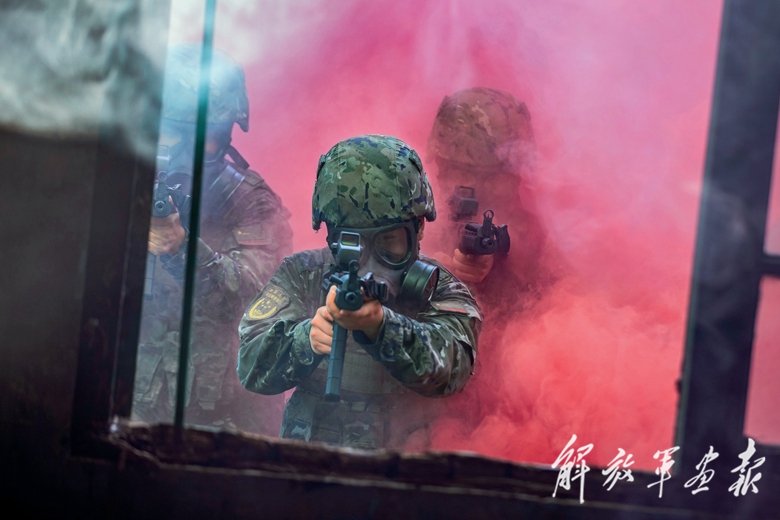 官兵在烟雾中隐蔽接“敌”。