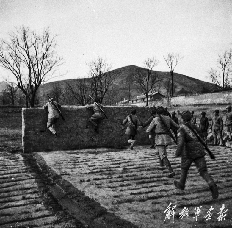 八路军晋察冀某部开展翻越障碍训练。