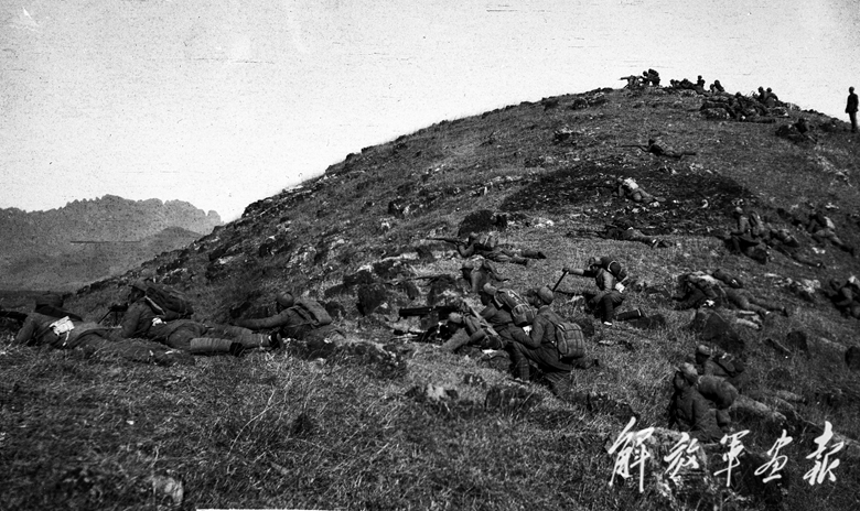 抗战期间,新四军某部进行山地进攻战斗训练。