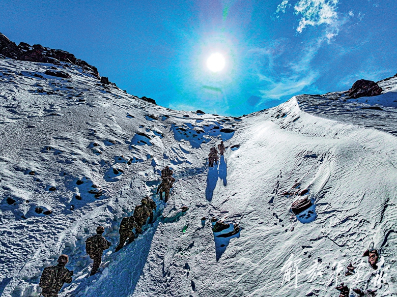 西藏日喀则军分区某部官兵在冰峰雪谷间巡逻执勤。(摄影/王 乾)