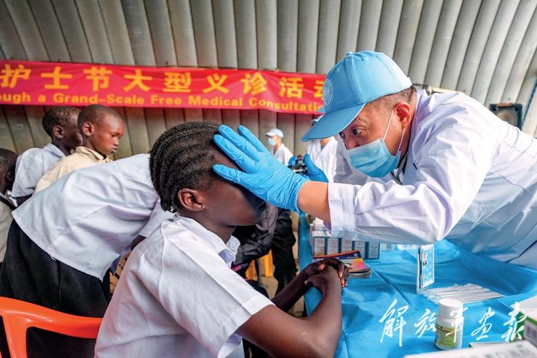 5月,中国第11批赴南苏丹(朱巴)维和步兵营携手援非医疗队赴流民所开展爱心义诊活动。(摄影/王昆博)