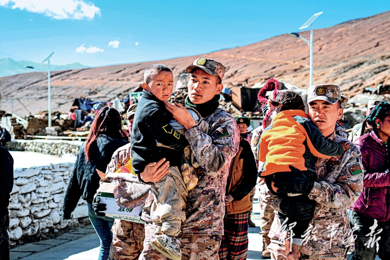 1月7日,西藏日喀则市定日县发生6.8级地震,日喀则军分区某部官兵迅速前往受灾区域开展救灾工作。图为官兵协助转移群众。(摄影/王 乾)