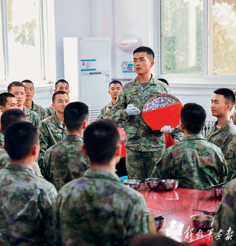 陆军第83集团军某旅“红一连”开展党史学习教育课,指导员为官兵讲述连队传家宝“红菜盘”背后的故事。(摄影/乔子丰)