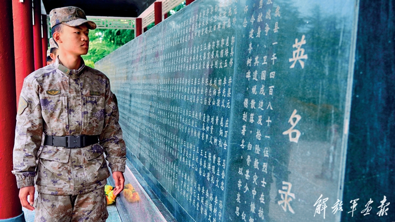 陆军某旅在烈士陵园开展“缅怀革命先烈、传承红色基因”活动。图为战士在英名录纪念碑前追思先烈。(摄影/张金山)