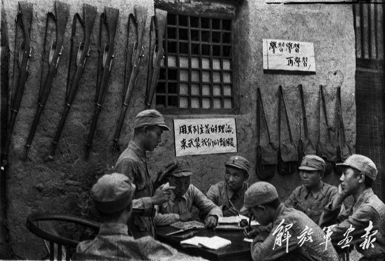 延安整风运动中,部队连以下单位进行正面教育。这是某部指导员给战士们讲课。