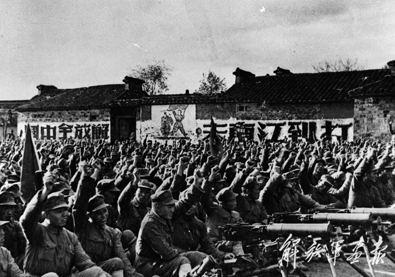 1949年4月,渡江战役前夕,第三野战军第二十军五十九师在永安洲举行誓师大会。战士们斗志昂扬,高呼口号。