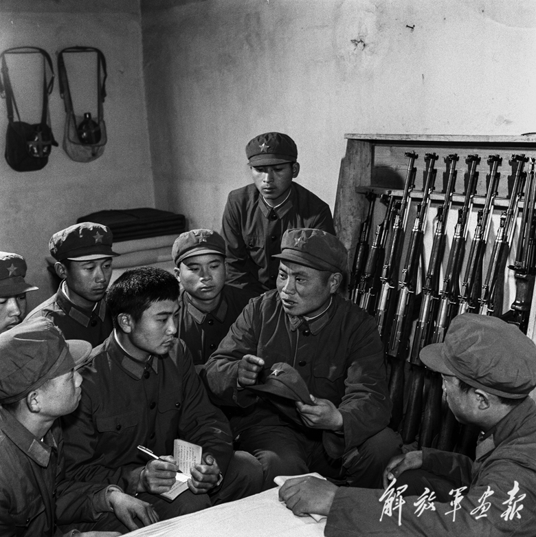 1977年,“刘老庄连”连长金海锋(右二)给战士讲述连队光荣历史。