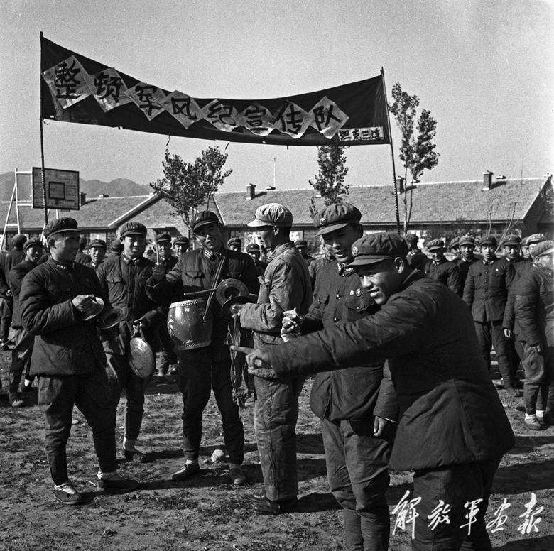 一个是一张照片呈现的“活泼的整训宣传,活跃的整训气氛”——1960年,某部宣传队在宣传整顿军风纪的重要性。