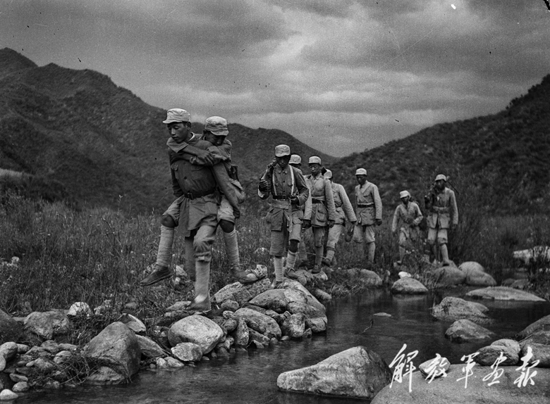 解放战争时期,某部连长背着生病的战士行军。