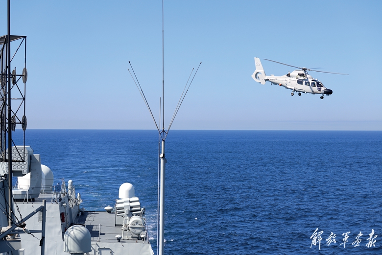 当地时间1月14日,中方海军唐山舰协同俄方直升机进行着舰训练。