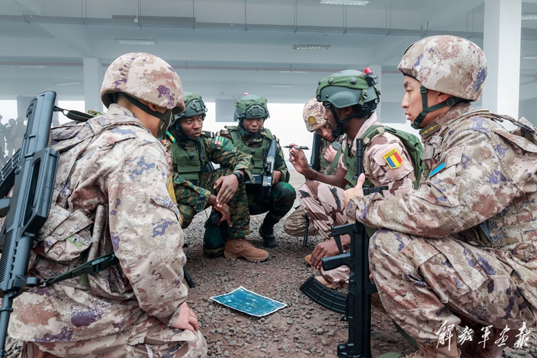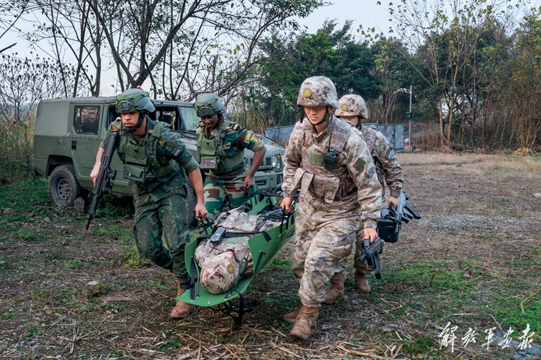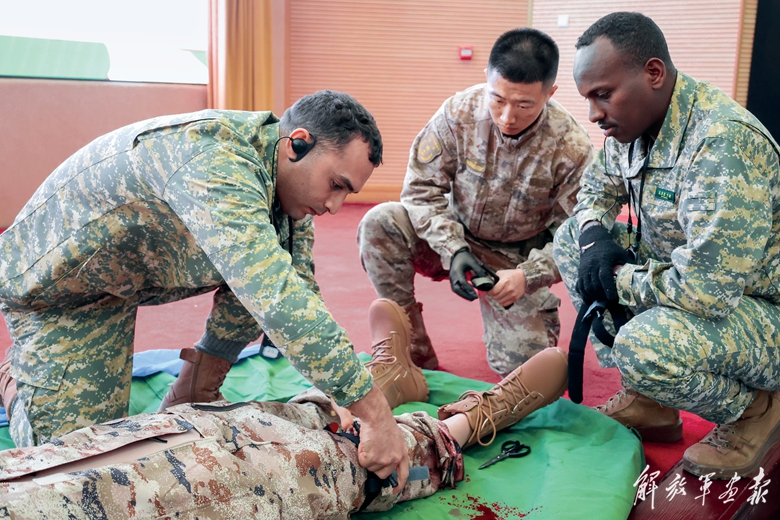 面对复杂战况,红方指挥员临机决断、灵活应对:防卫分队扩大侦察范围,实时回传战场态势;运输分队变换路线、交替掩护,突破蓝方重重干扰;医疗分队遇“伤”即动,现场施救并快速后送……对抗训练中,中外学员默契协作、沉着处置,圆满完成了任务。