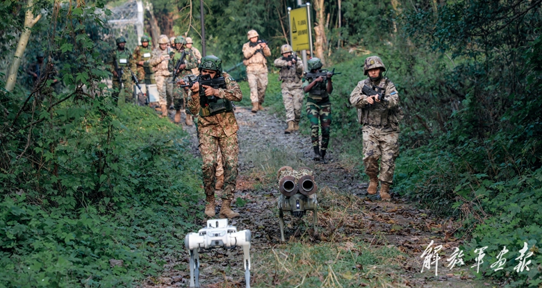 对抗训练中,红方防卫分队操控机器狗前出侦察。