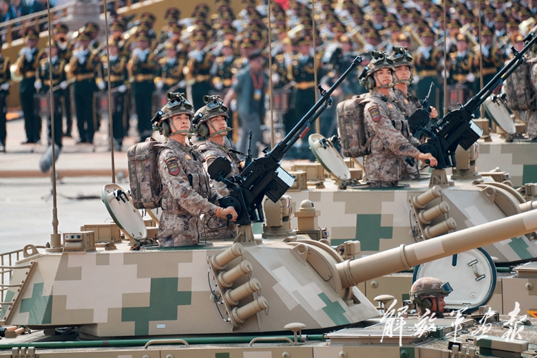 地面突击方队的22辆战车呈箭形编队通过天安门广场,接受党和人民检阅。
