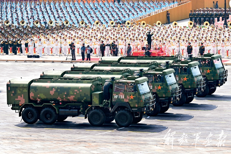 后勤保障方队展示我军新一代保障装备。