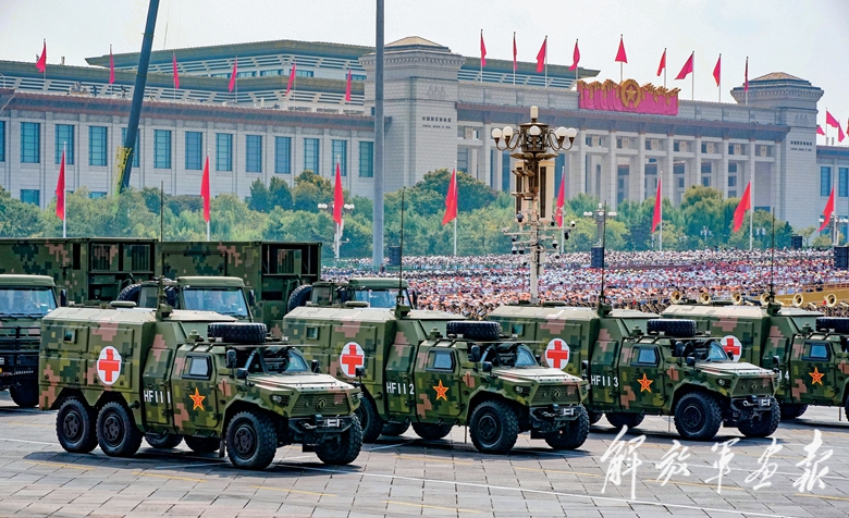 后勤保障方队在天安门广场接受检阅,向全世界展示我军后勤保障的新质力量。